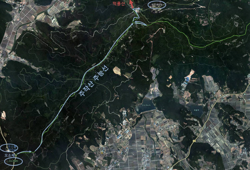 ▼ 올라왔던 곳을 내려다 보면 오소재에 주차했던 장소가 보입니다. 왼편에 오소재 쉼터(공원), 오른편에 오소재 약수터(주차장,화장실)