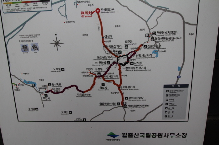 산성대 입구 (기찬 묏길) - 산성대 (산성치) - 통천문 - 천황봉 - 통천문 - 구름다리 - 바람폭포 - 월출산 야영장 (5시간 여 산행)