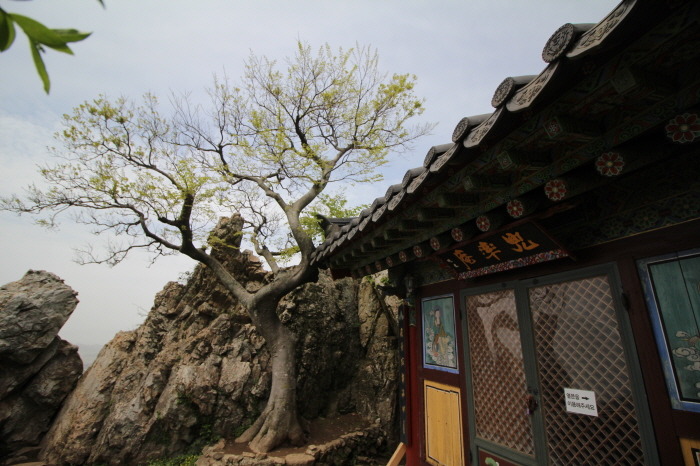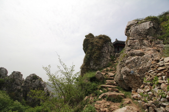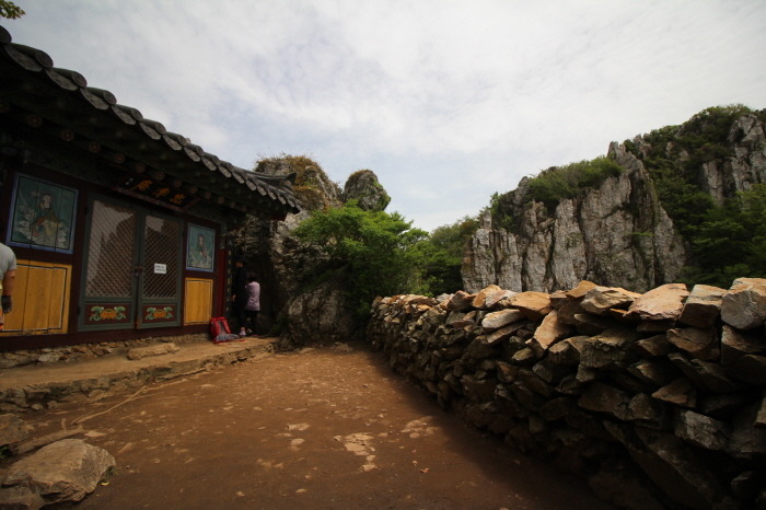 ▼ 거대한 암벽 틈새에 돌을 채워넣고 그 위에 지은 암자 도솔암