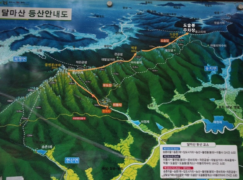 미황사 주차장 - 헬기장 - 불썬봉 (달마봉) - 도솔암 - 도솔봉 주차장 → 콜 택시로 미황사 주차장 이동 (6~7시간 소요)