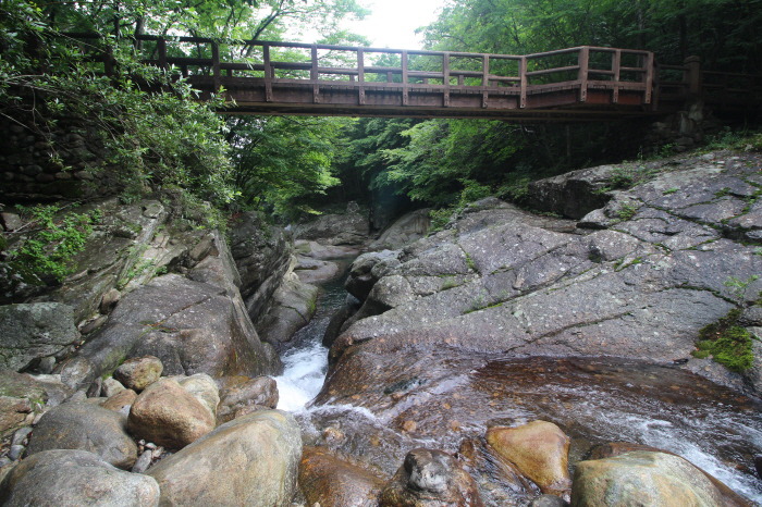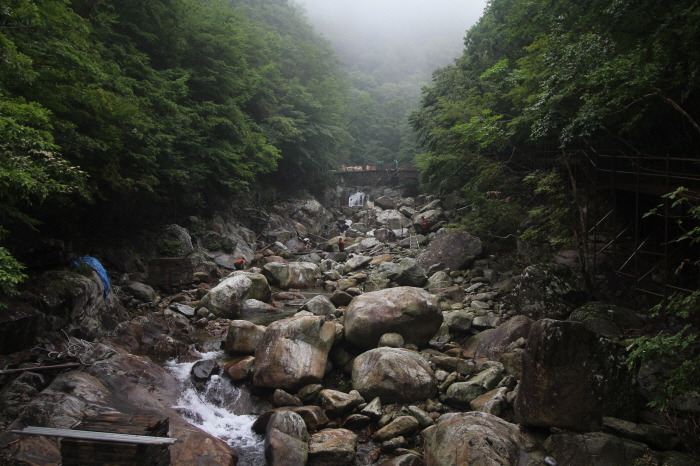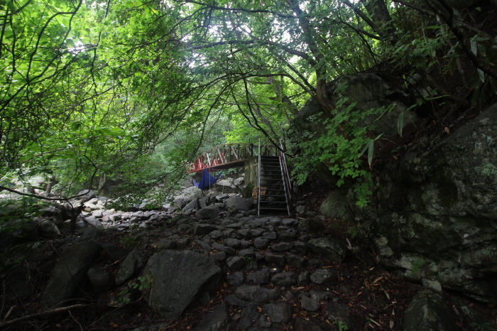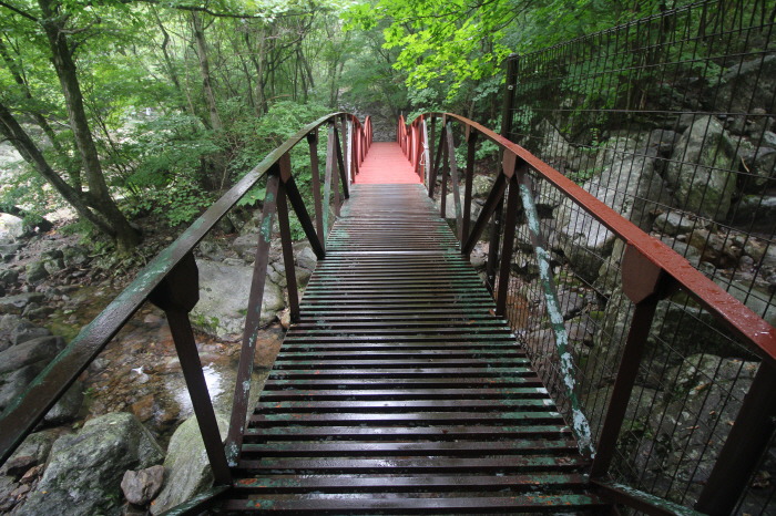 다리 오른쪽, 철망 너머에 있는 계곡을 따라 올라가면 "실비단 폭포"가 나오기 때문입니다. 비법정탐방로.