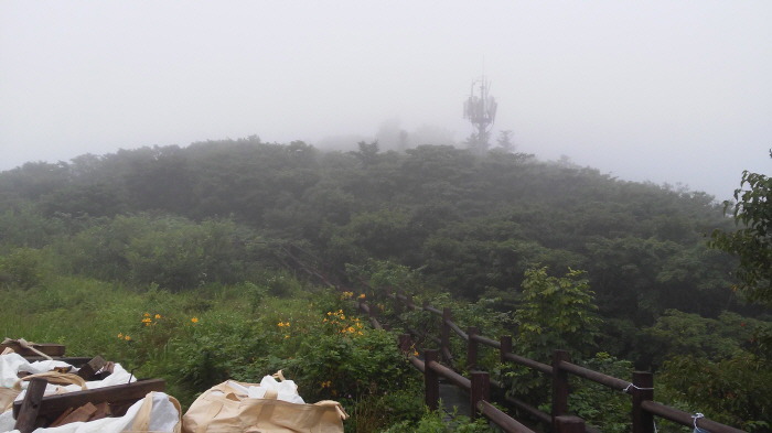 ▼ 화개재 정상(1316m)에 작업용 목재들이 남아 있었습니다. 비도 그럭저럭 내리고 있어서, 주변 시야가 거의 없었습니다.
