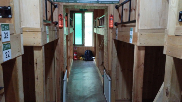 1,2층 침상으로 되어있고, 독서실 처럼 칸막이가 살짝 있습니다. 칸막이 윗부분에 등산배낭 등을 올려놓을 수 있는 선반이 하나 있구요.