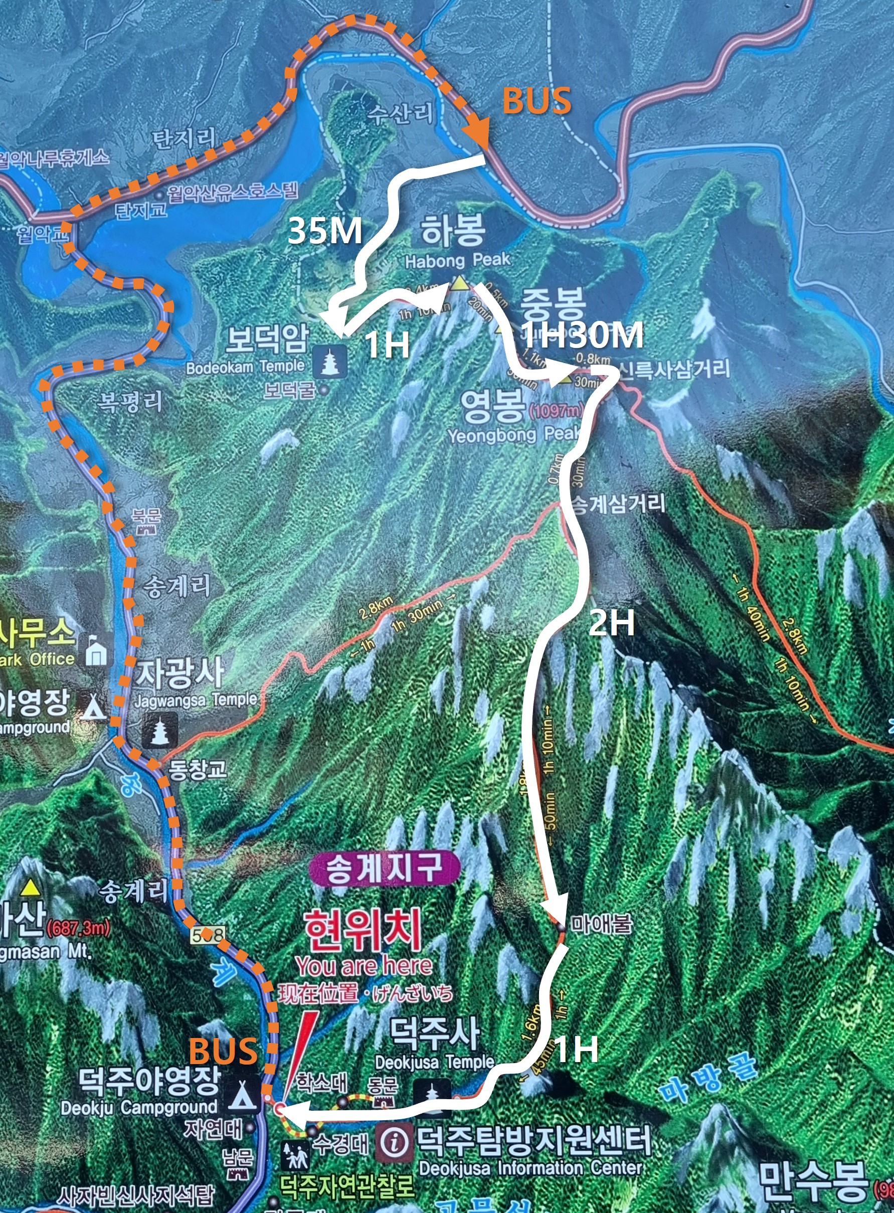 등산코스는 보덕암 ~ 하,중,영봉 ~ 마애불 ~ 덕주사 6시간 30분 가량 소요 되었습니다.
