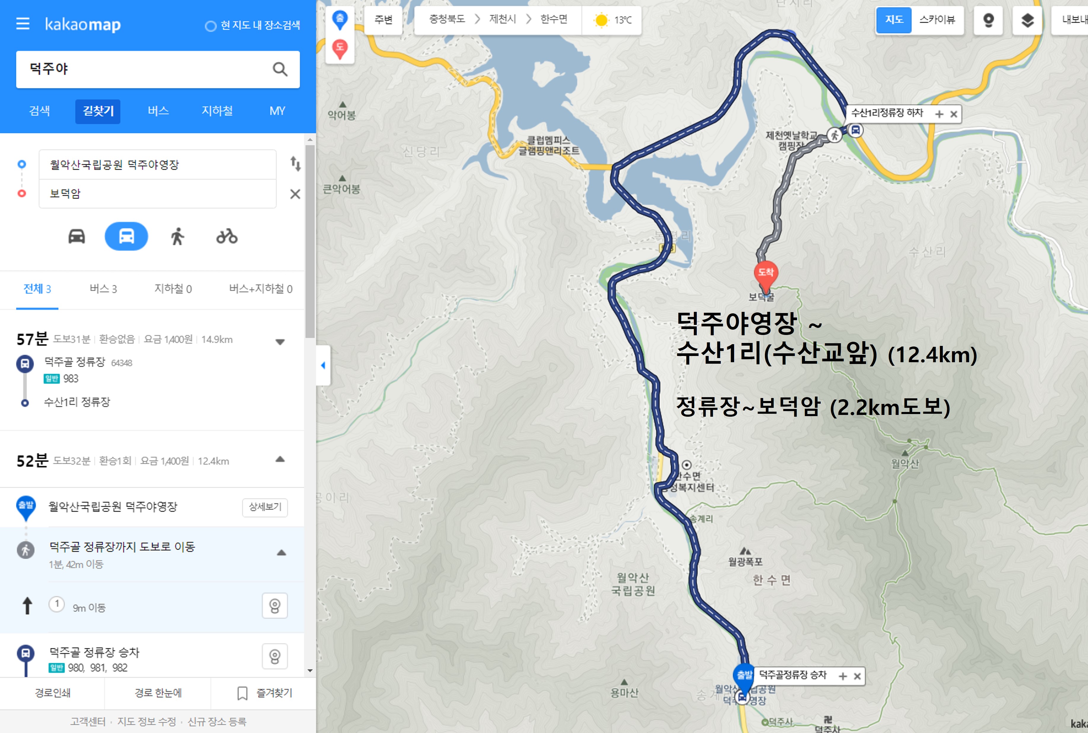 "카카오맵"으로 '길찾기'를 해서 덕산야영장 ~ 보덕암 까지 "대중교통"(버스)를 선택하니