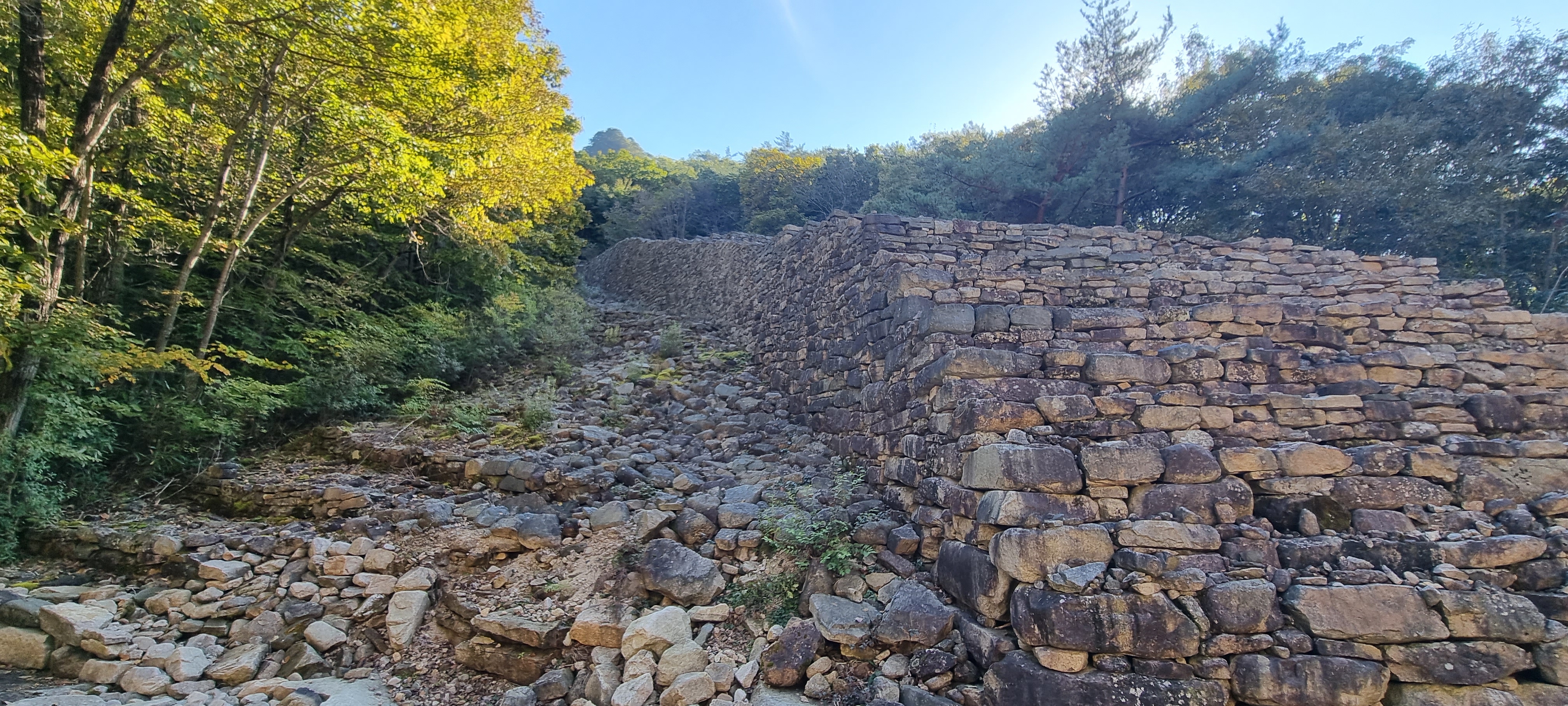 다시 잘 정돈된, 돌 계단과 돌 블록 길을 걸어 내려옵니다.