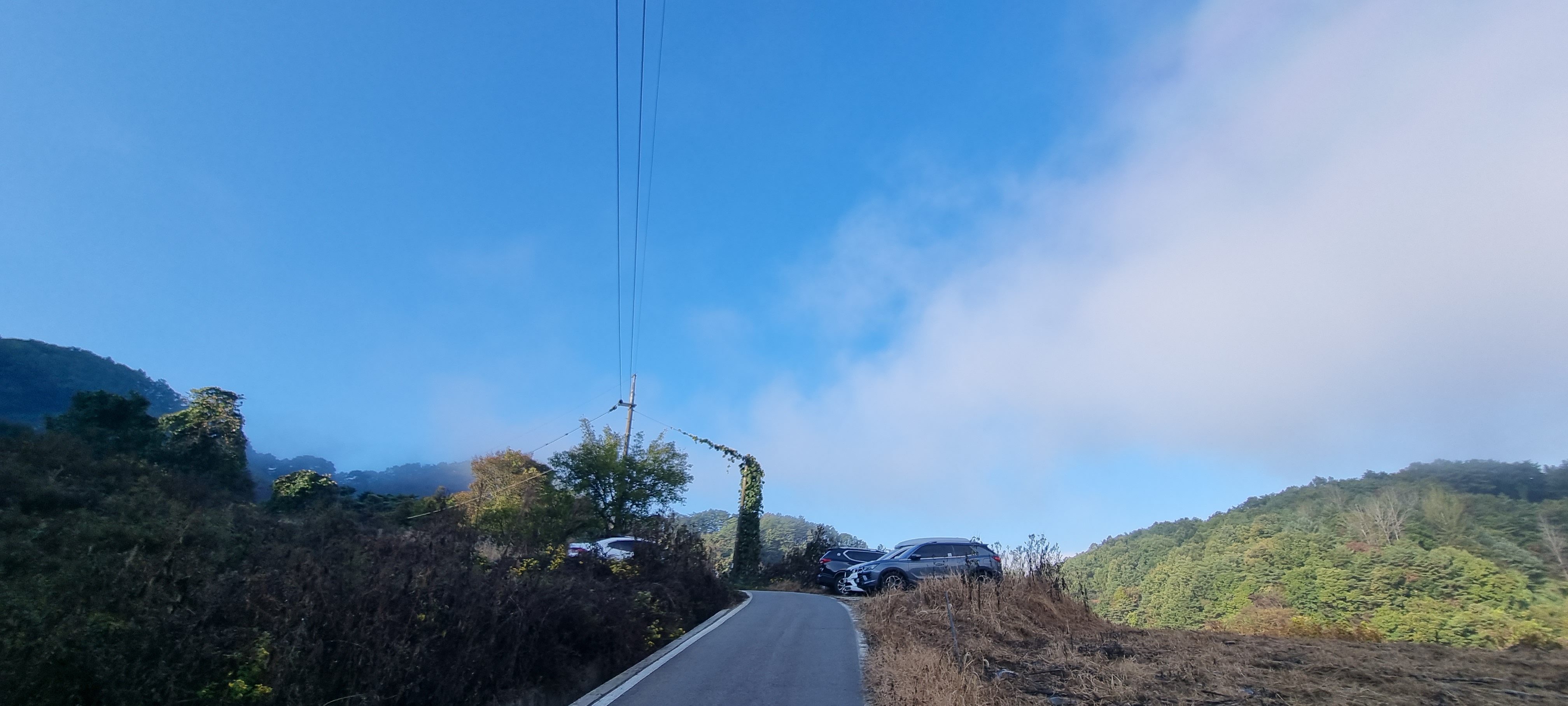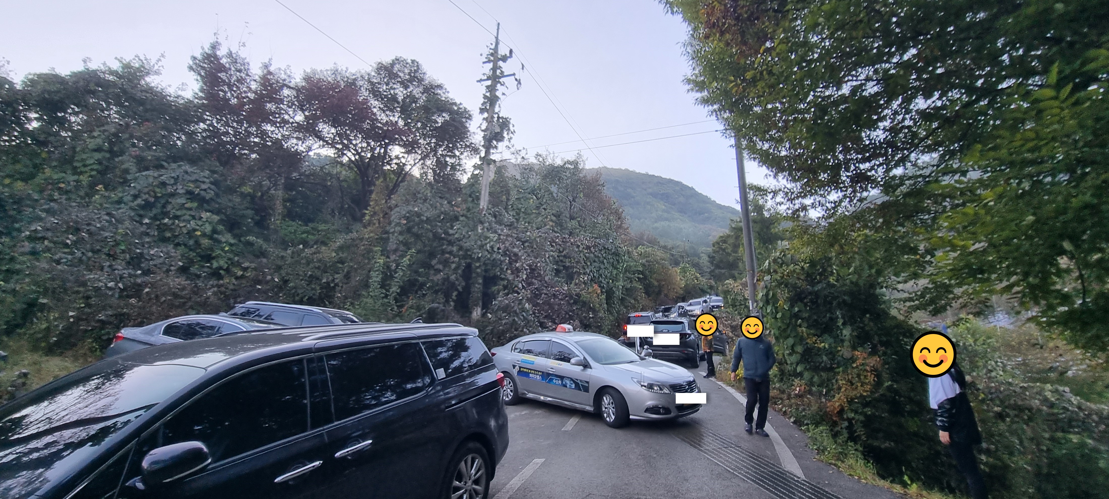 갓길에 주차된 차량들이 보이기 시작하네요.