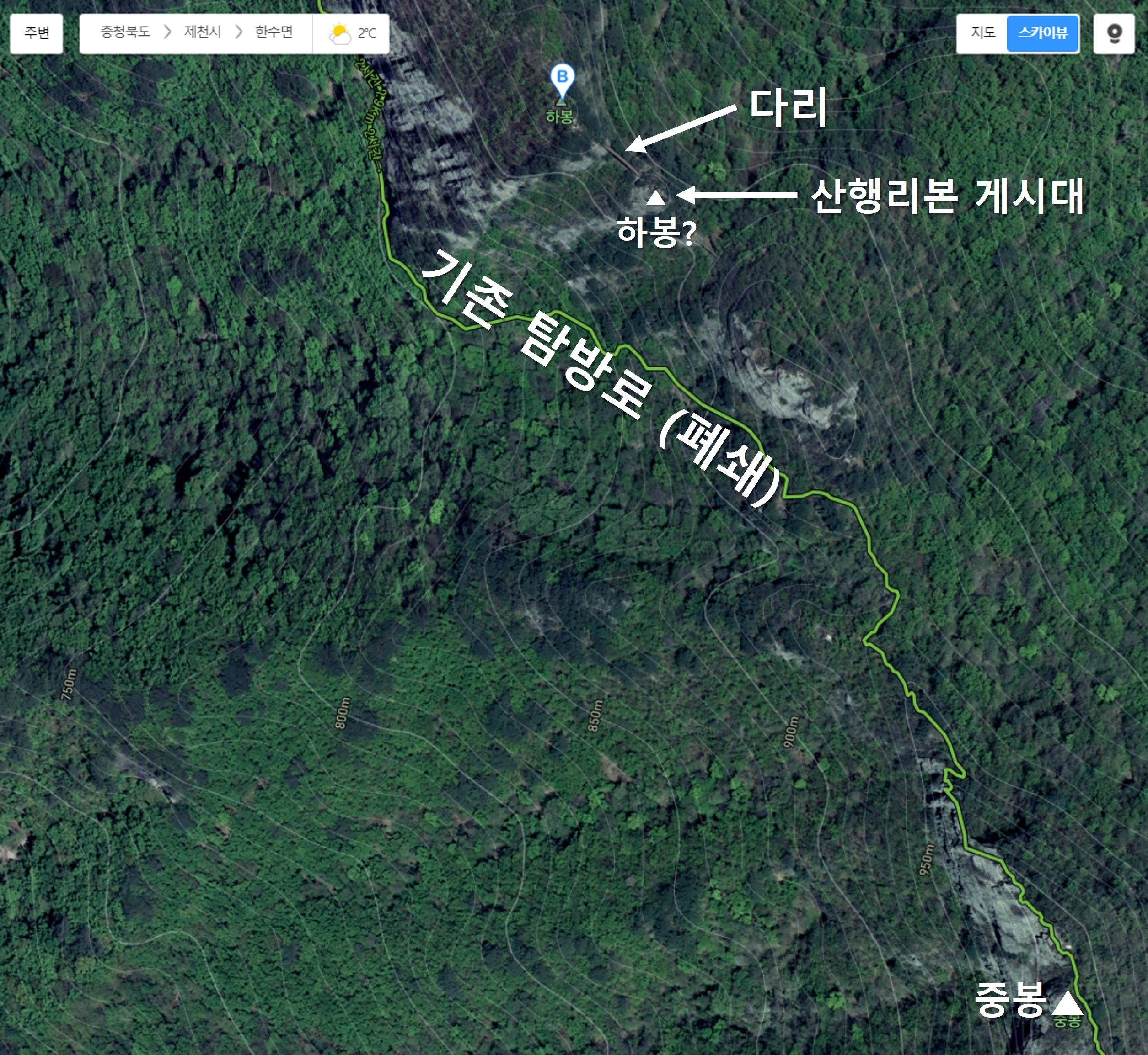 '산행 리본 게시대'라는 설치대가 있는 걸로 보아서, 다리 건너편의 봉우리가 하봉이 맞는 것 같습니다.
