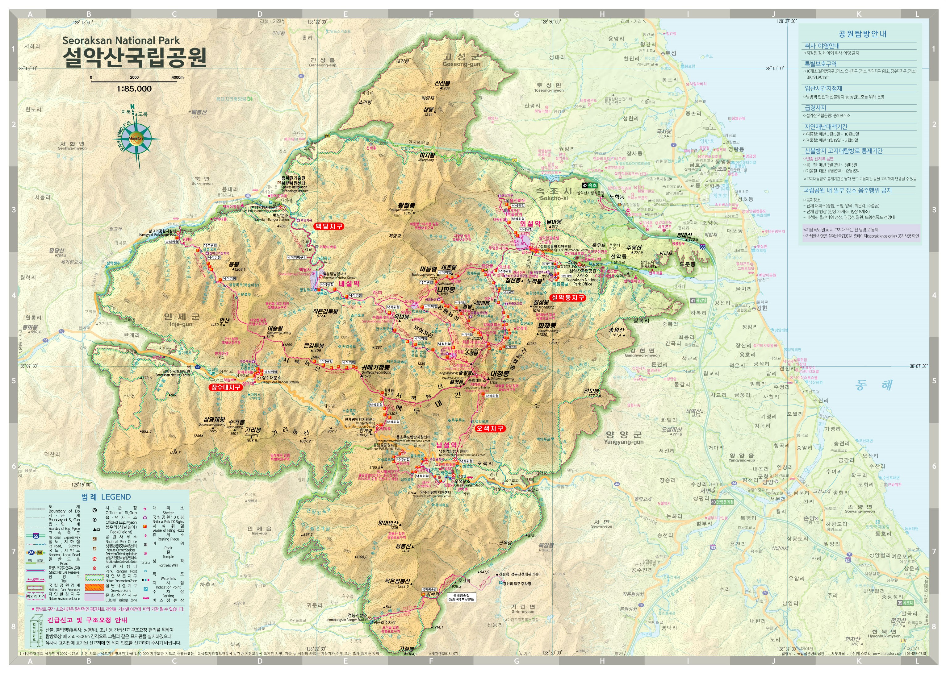 코스 오른 쪽에 '탐방질서 지키기' 안내판이 보입니다 (자연보호, 야영 금지, 쓰레기 투척 금지)