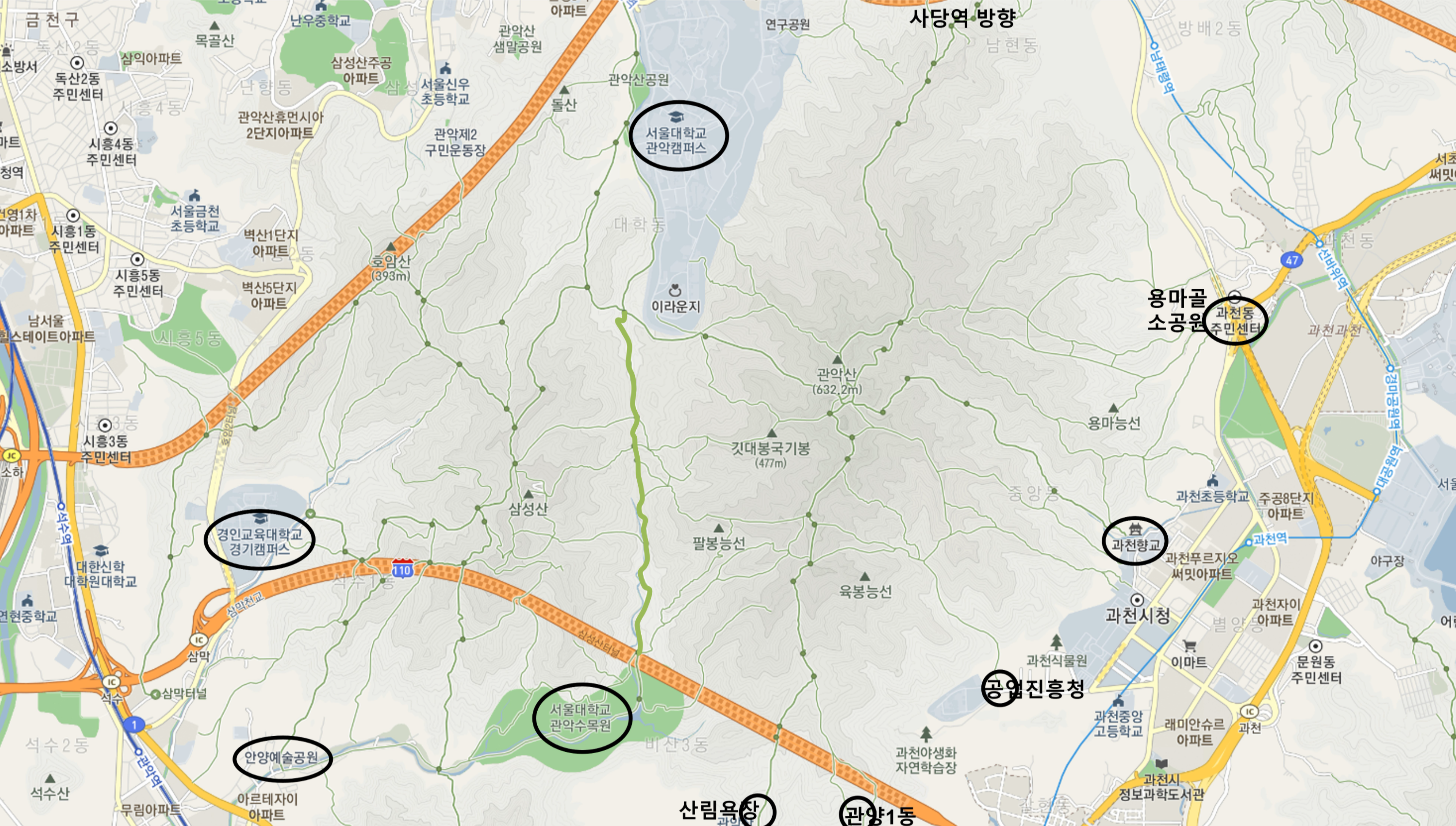 관악산의 여러 능선 중에서, '선바위역' 방향의 '용마골소공원주차장'에서 시작하는 코스 입니다.