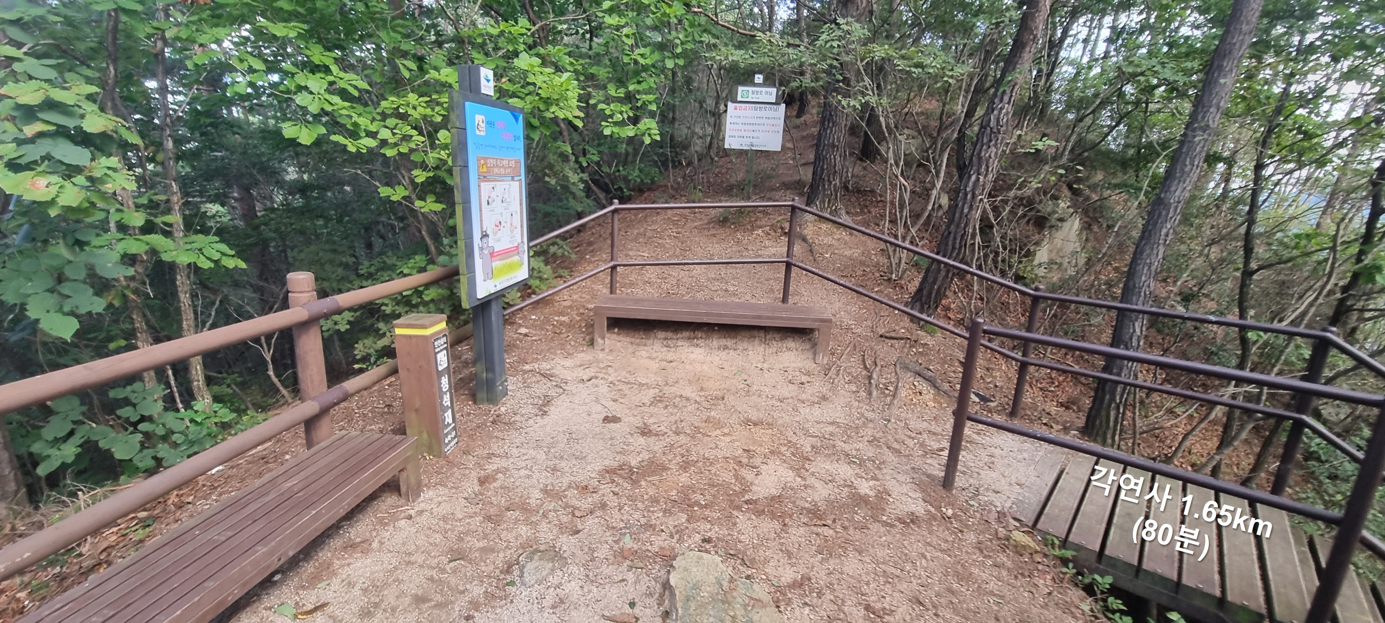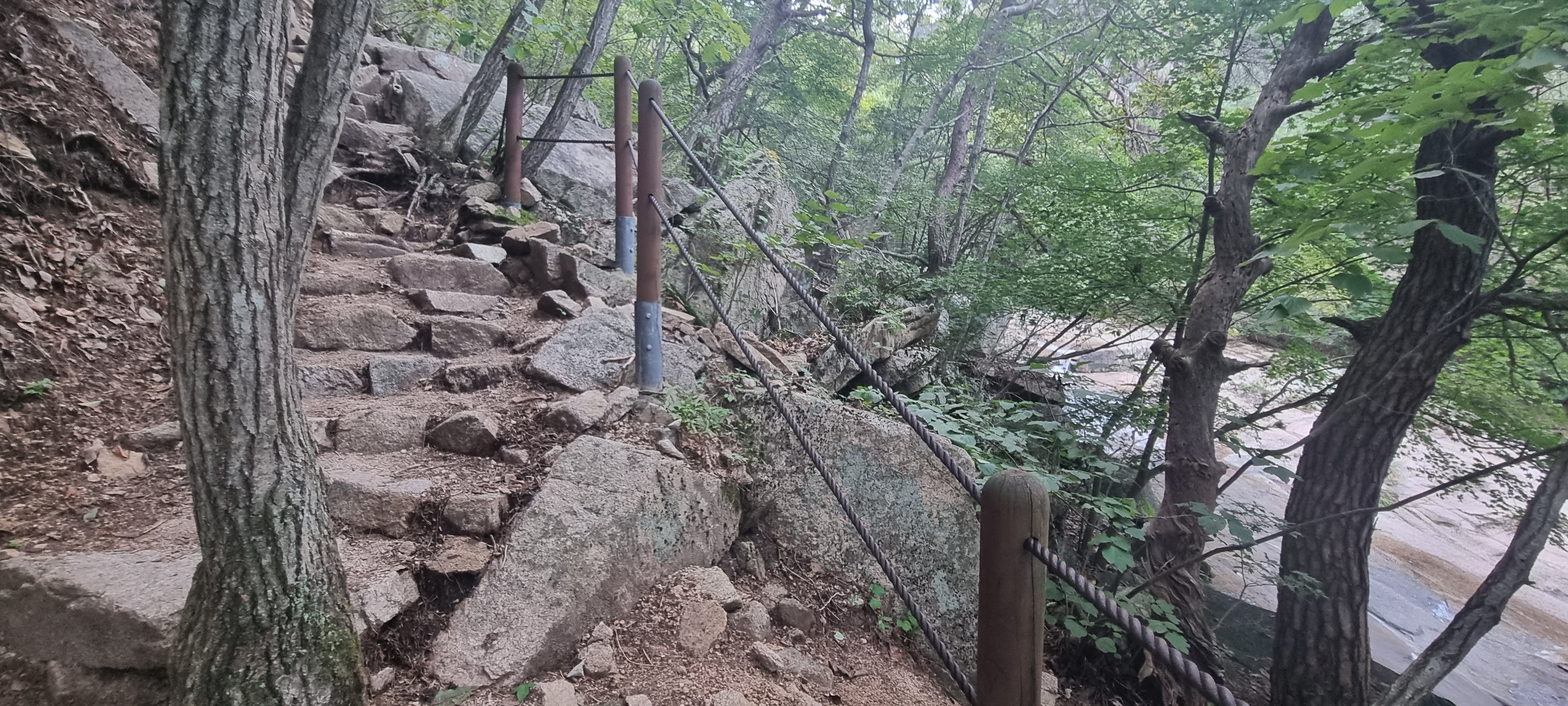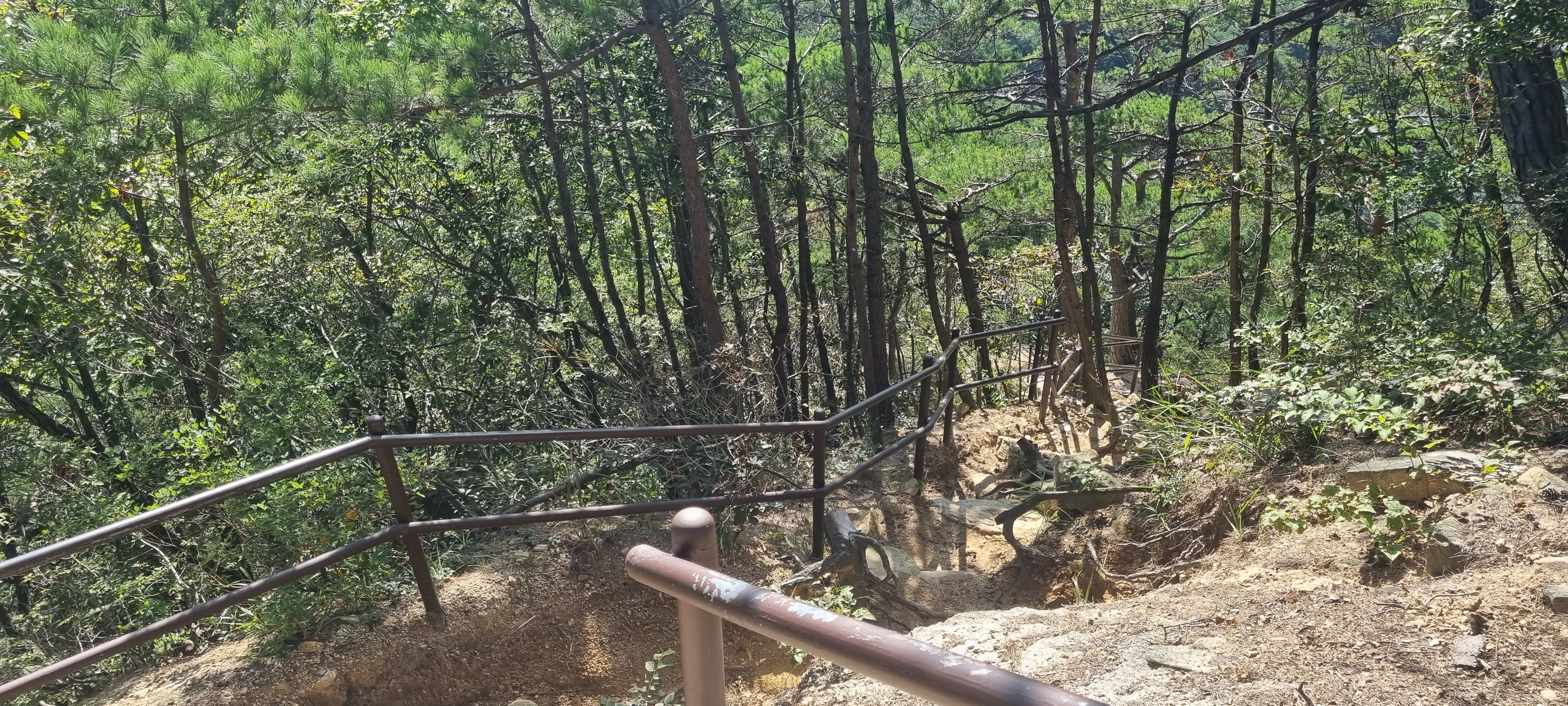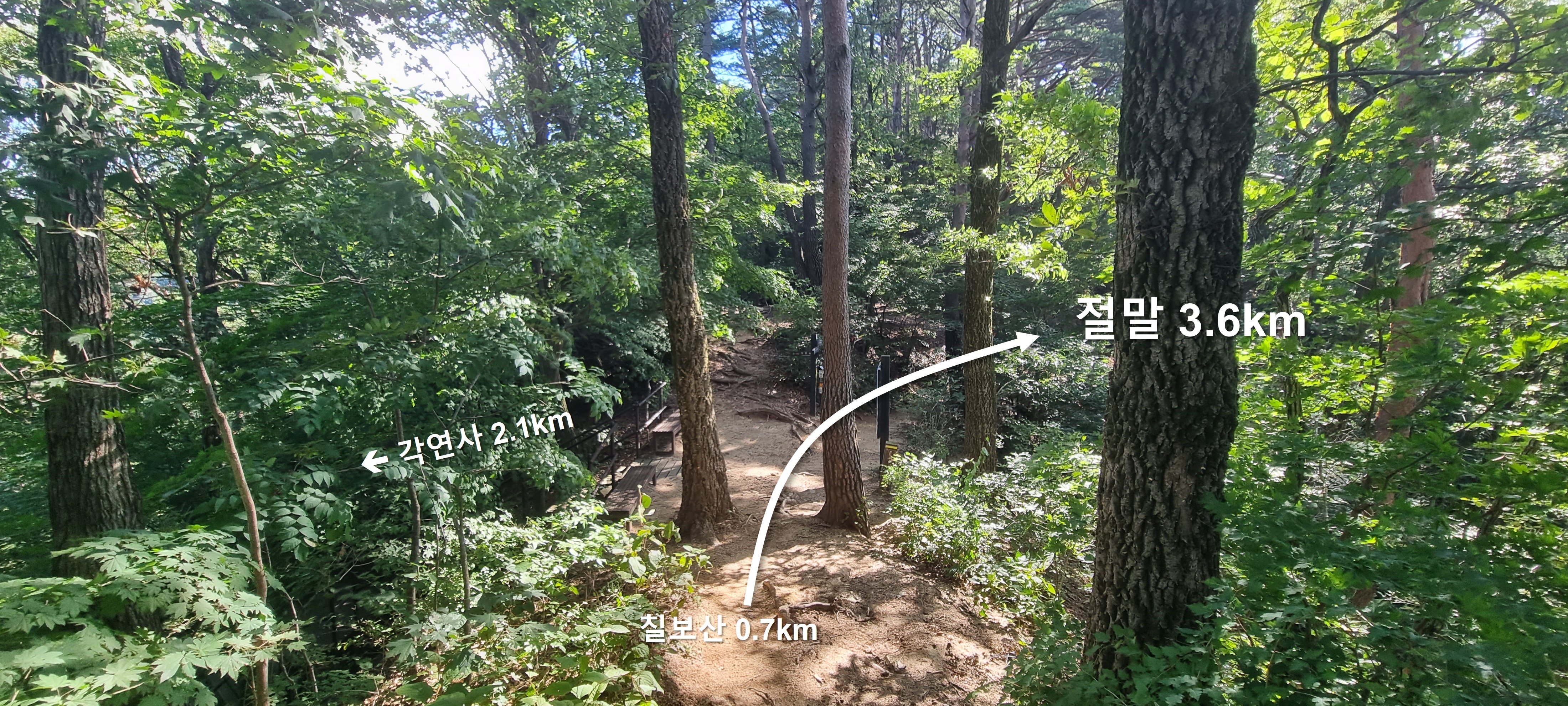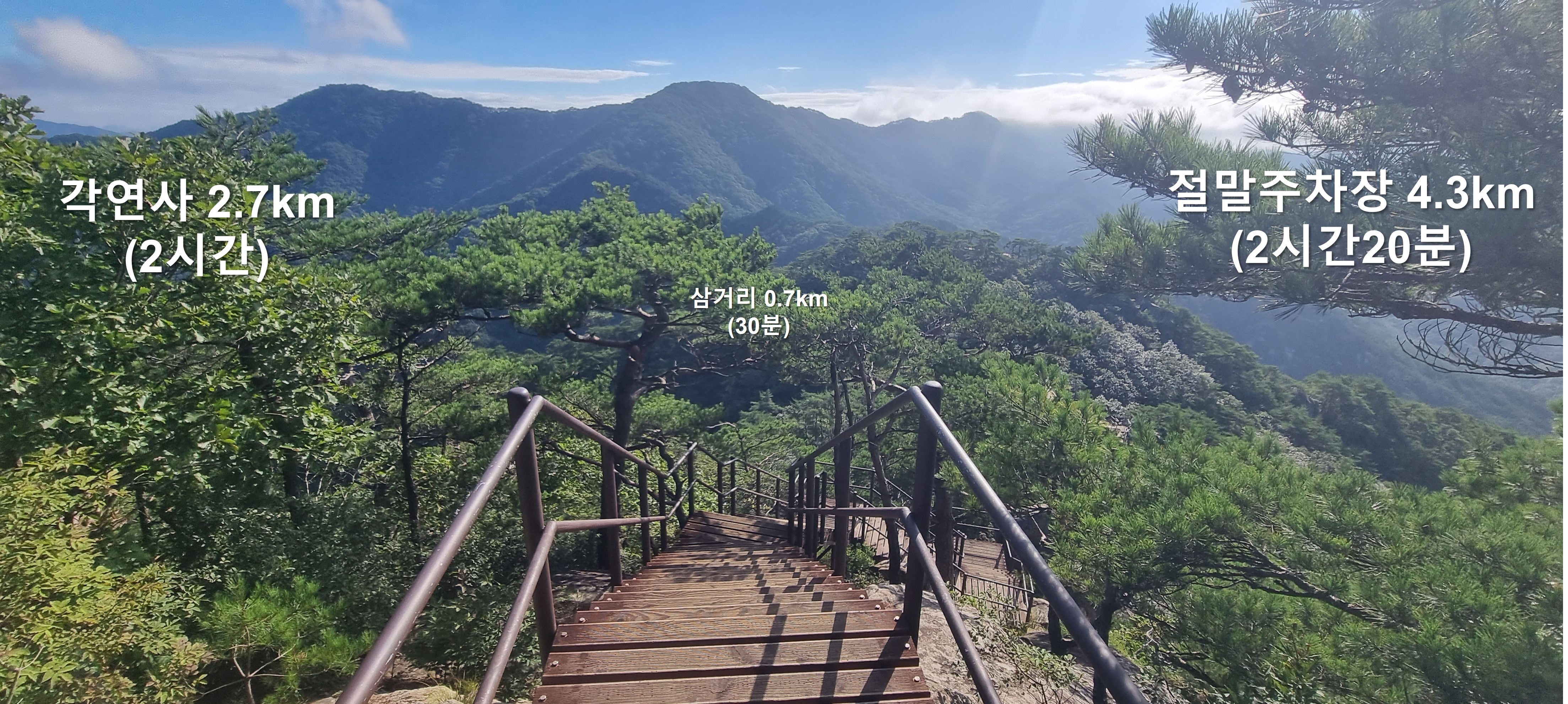 계단을 30분 정도 내려와서, 삼거리에서 '절말' 방향으로 하산할 예정입니다.