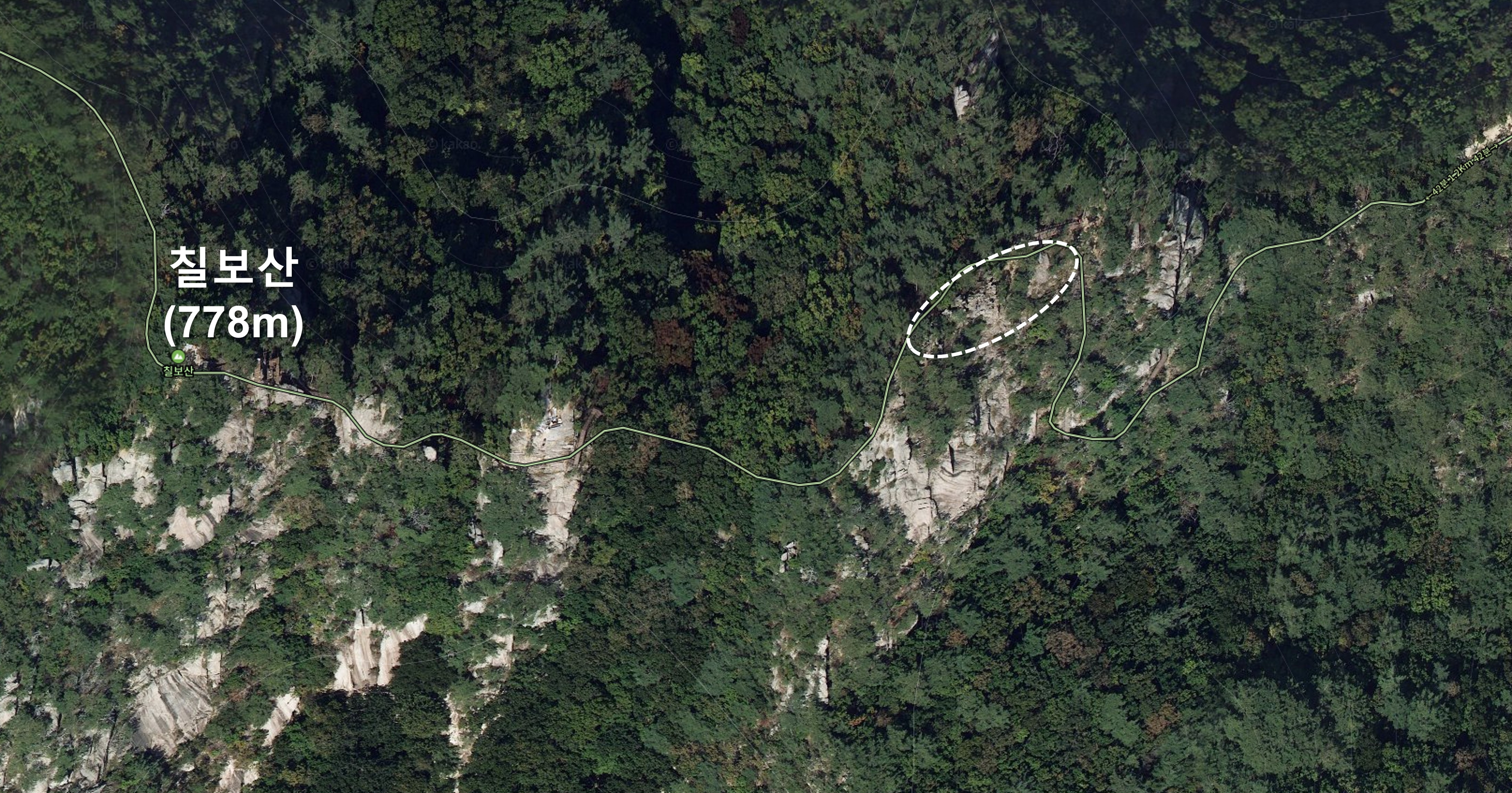 칠보산 정상에서 내려와서.....................동그라미 친 부분................ 등산로 오른쪽으로 살짝 벗어난 부분