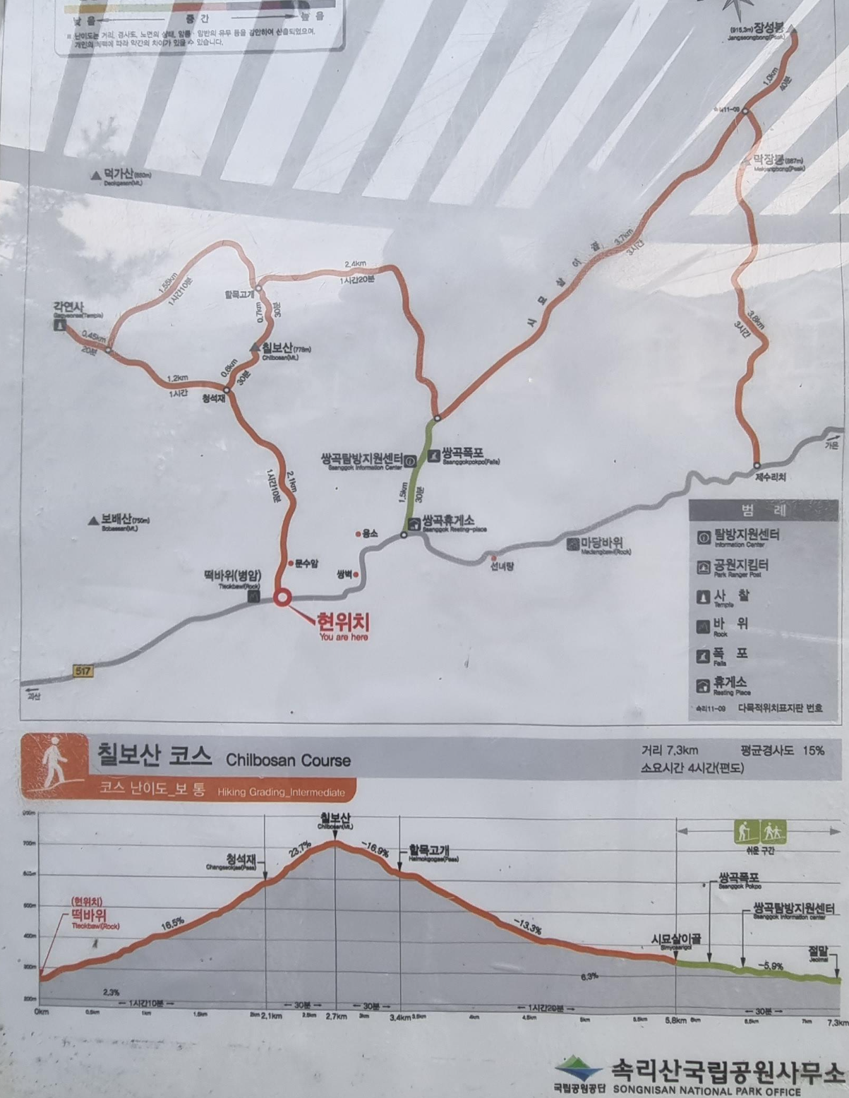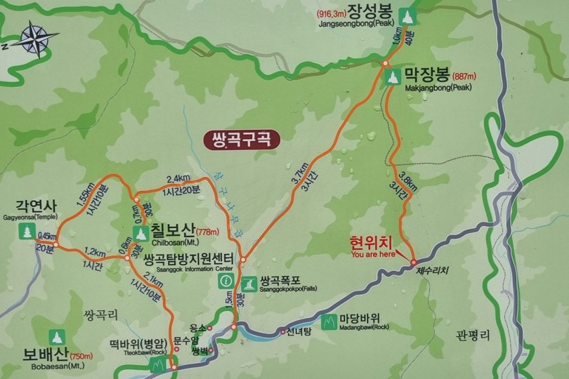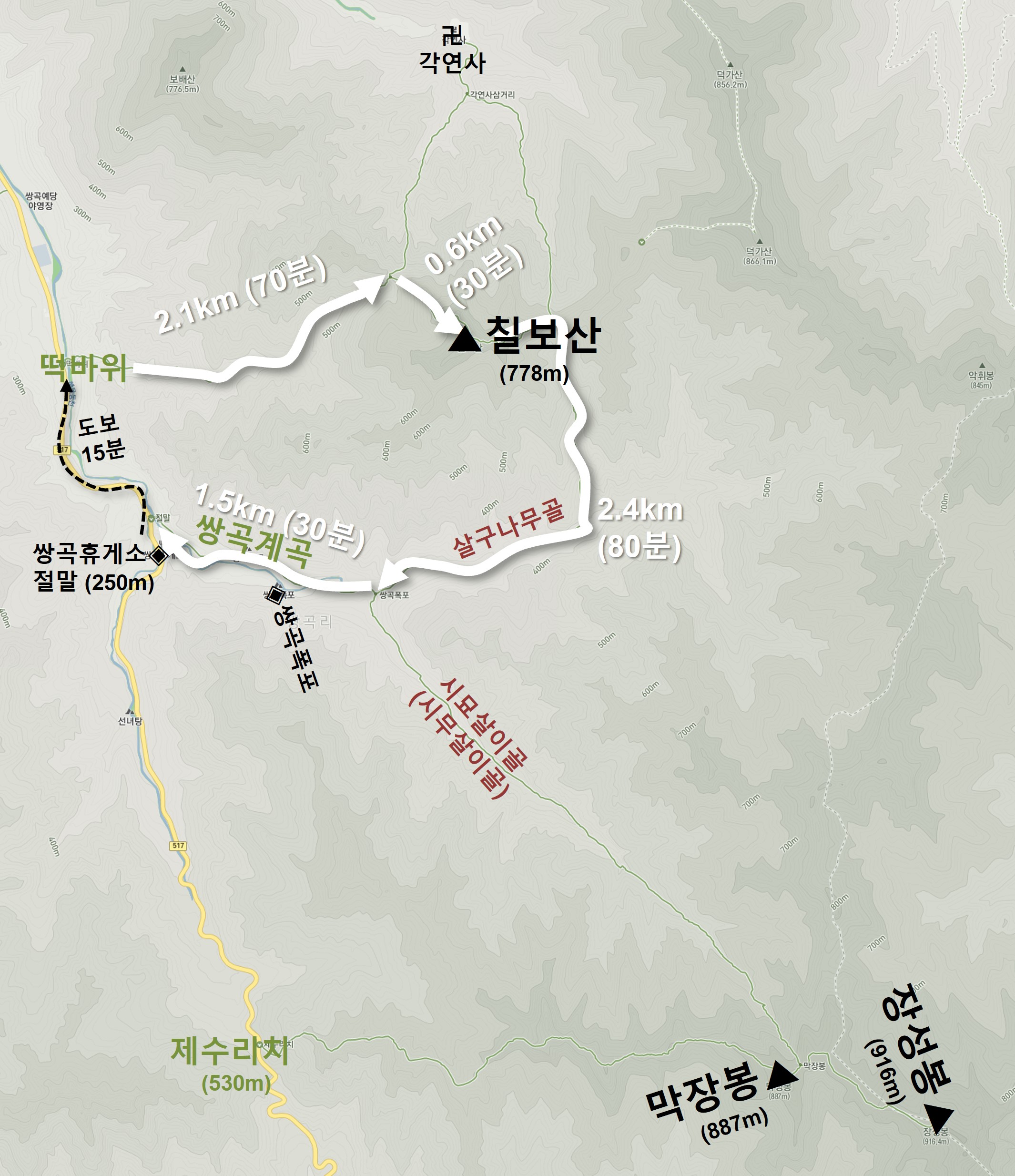 떡바위 - 칠보산 - 살구나무골 - 쌍곡폭포 - 절말 - 떡바위 (원점회귀, 4시간 코스)