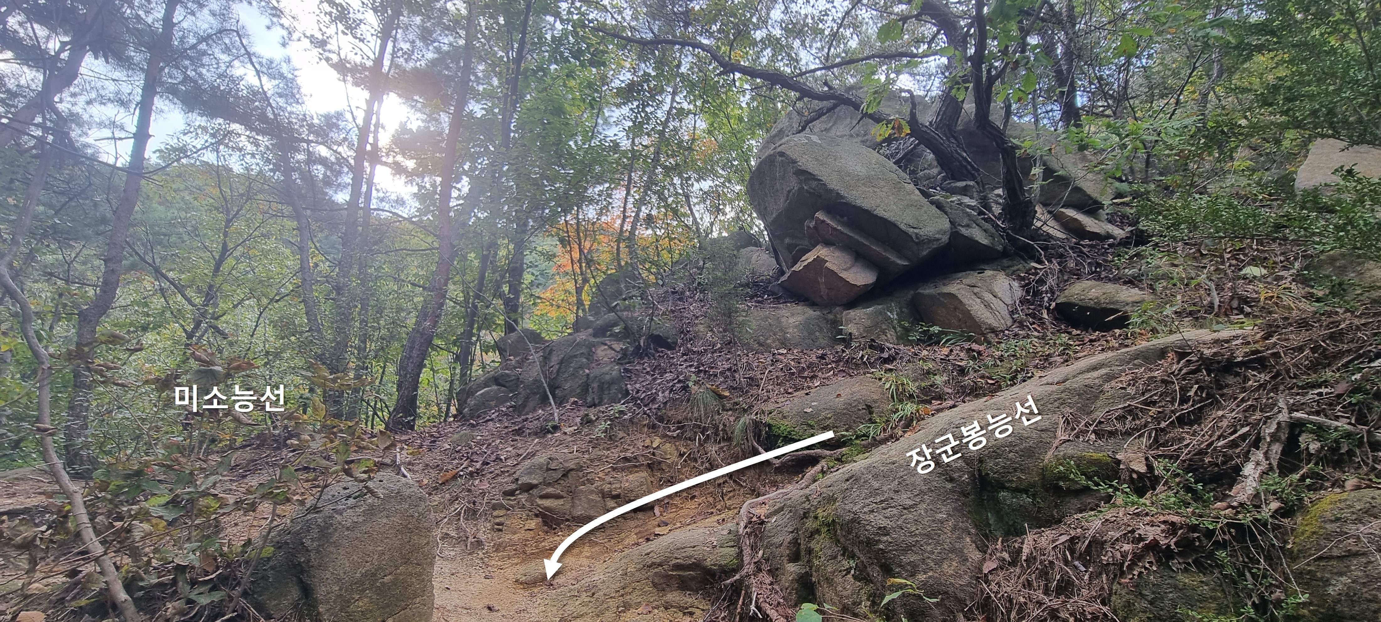 이런 모양의 작은 주변 바위가 보이면, 근처에서 '장군봉 능선' 갈림길을 찾으시면 될 것 같네요.