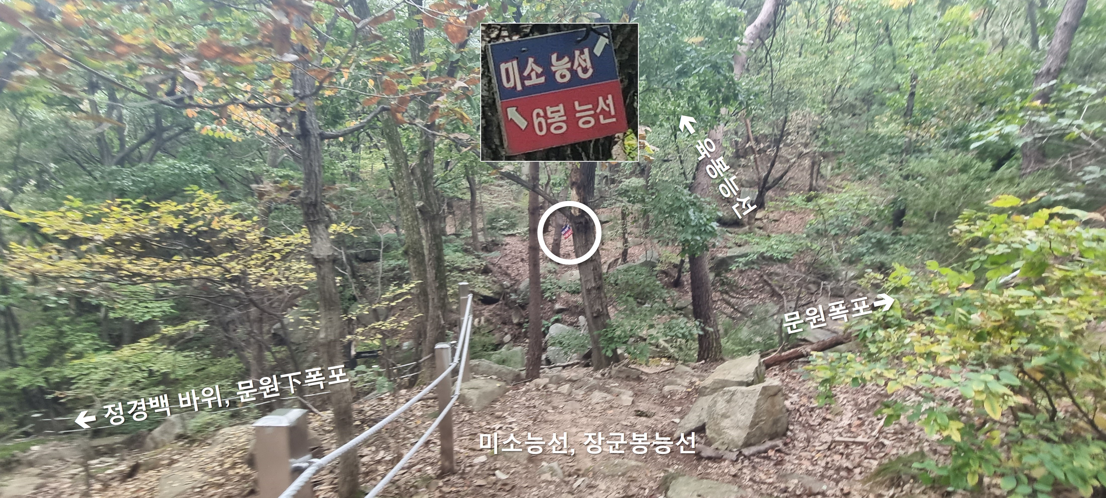 문원폭포 거의 다 내려와서 미소능선 코스와 합류하는 지점 입니다.