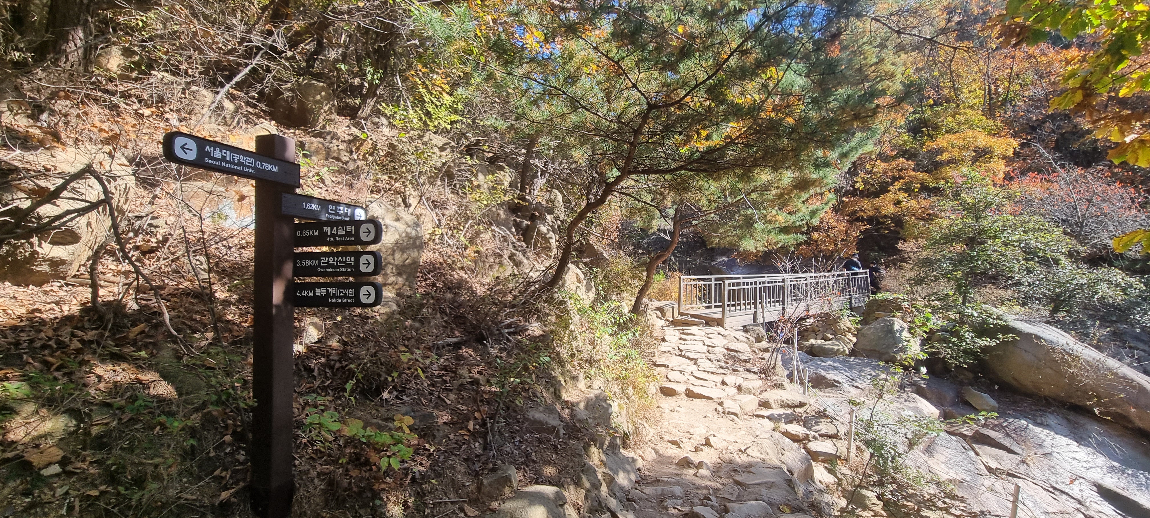 문원폭포 → 미소능선 → 팔봉능선 → 서울대 제4쉼터 → 버섯바위능선 → 케이블능선 →문원폭포
