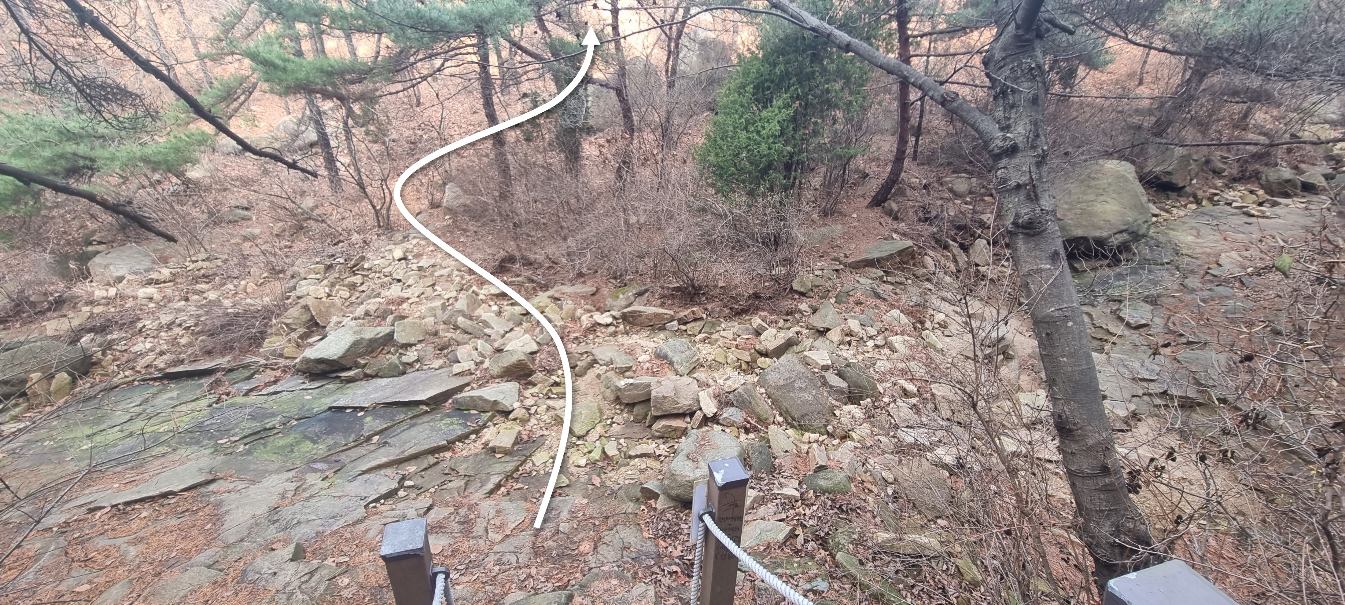 계단 끝에서 여러갈래 길이 있지만, 마른 계곡 건너서 , 거의 직진 방향으로 바로 올라가기 시작합니다.