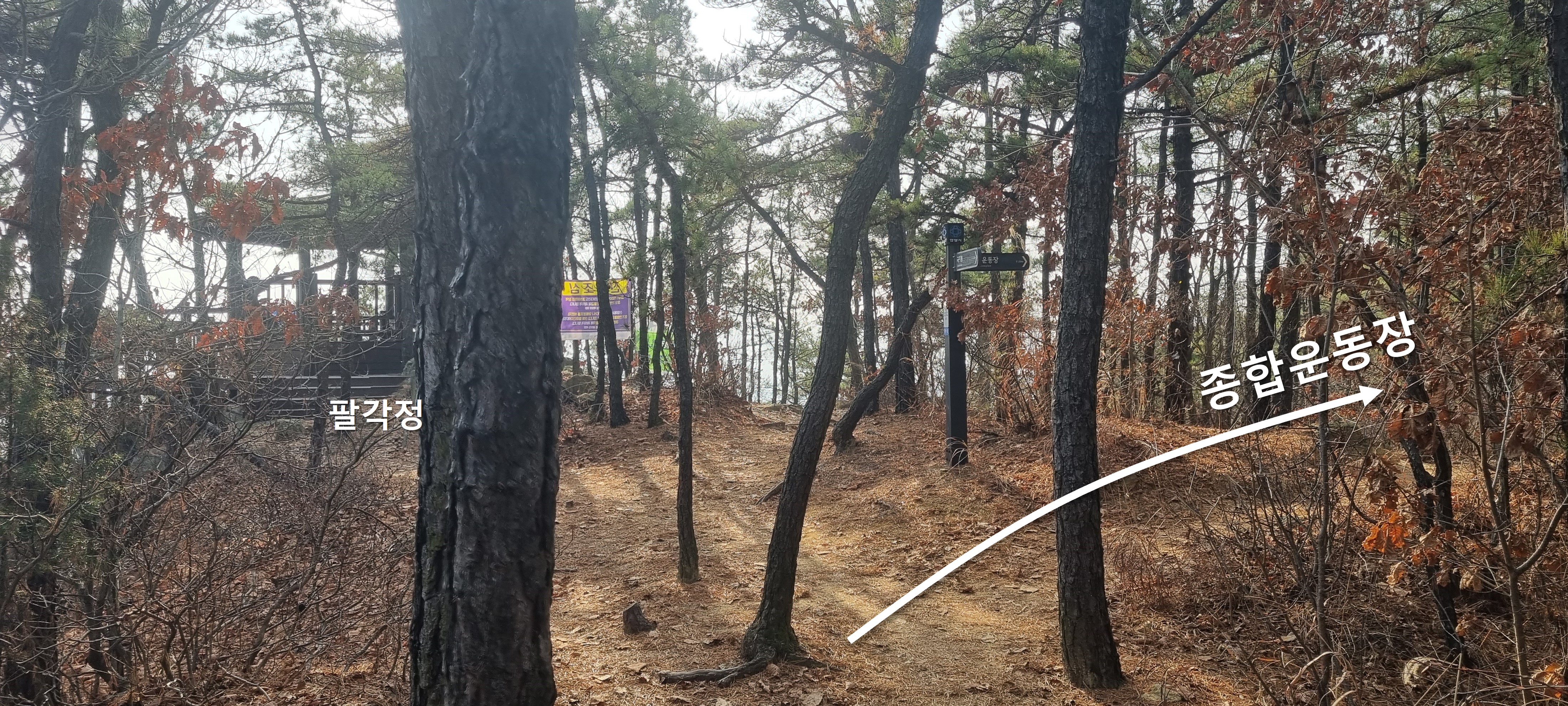 Y자 갈림길에서 이정표가 나오면, 우측 '팔각정' 방향으로!