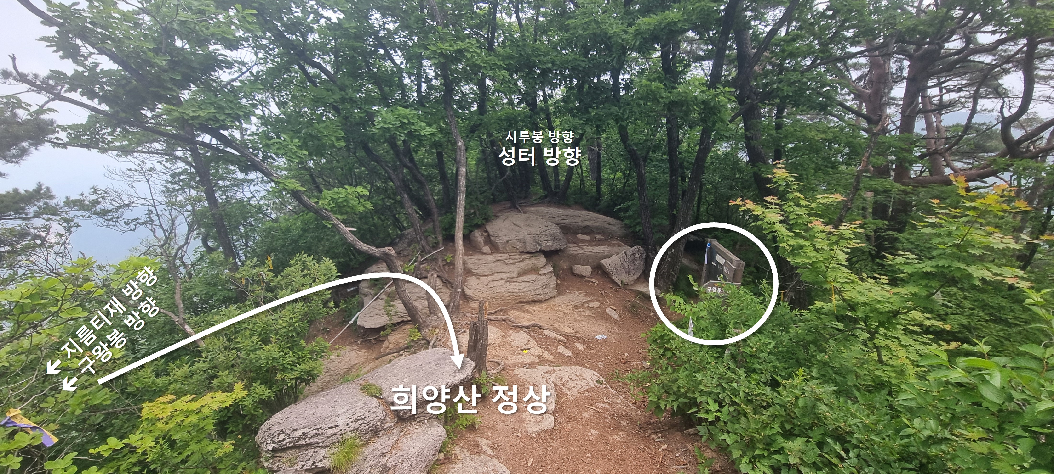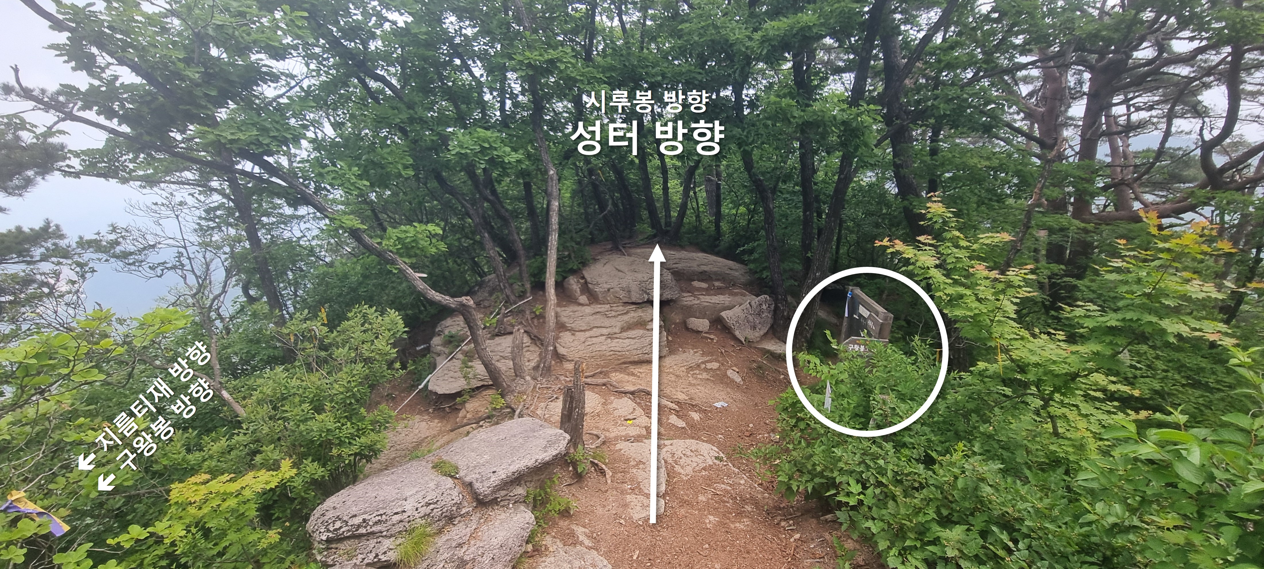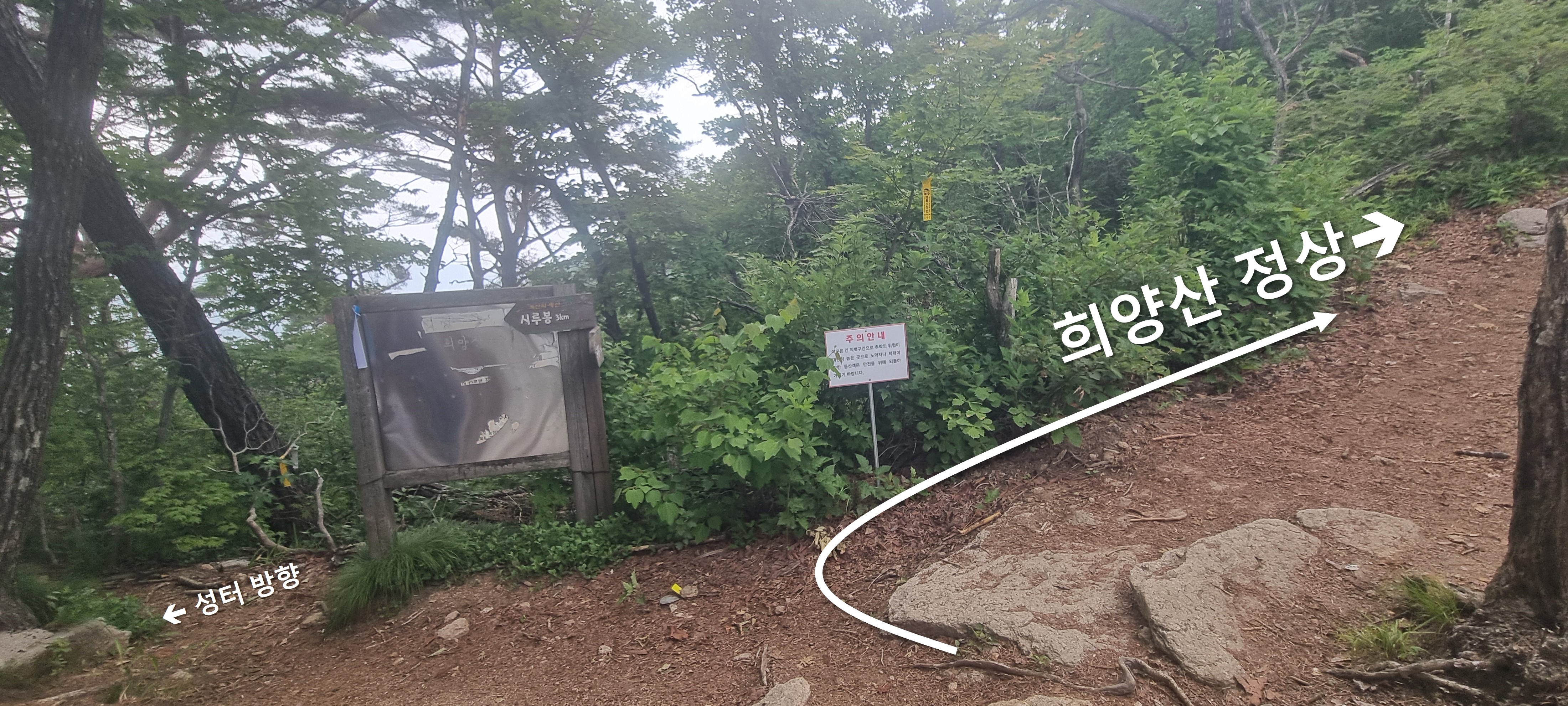 반대 방향이, 하산길인 '성터'(희양폭포)방향, '시루봉'방향 입니다.