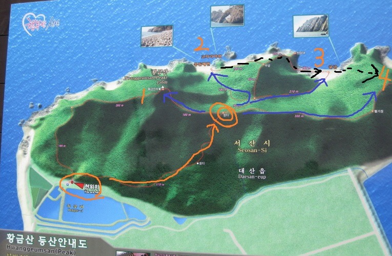 파란색 화살표 길로 가시는게 제일 편하고 확실 합니다. 저는 2 → 3 → 4 를 검정색 점선을 따라, 해안가의 산을 타고 이동했습니다.